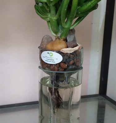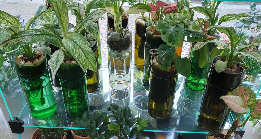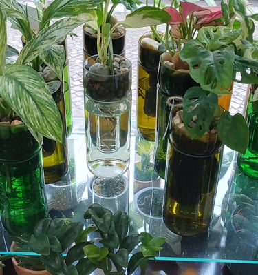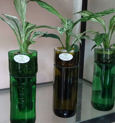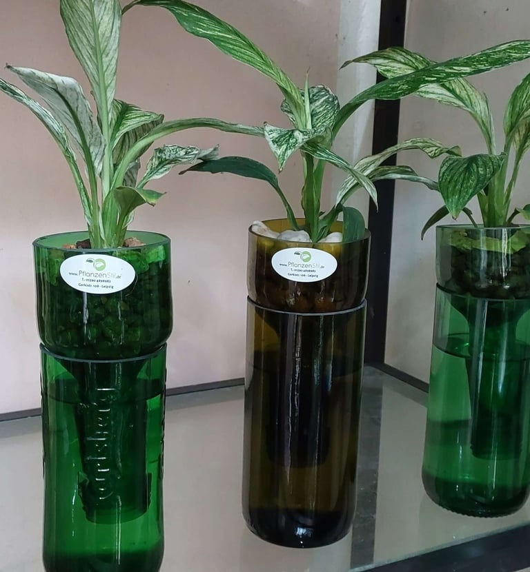 Wir haben uns auf handgemachte Upcycling-Pflanzengläser aus Flaschen, andere (Glas)gefäße mit Hydrokulturen und Hydrokulturen ohne Substrat in dekorativen Gefäßen spezialisiert.