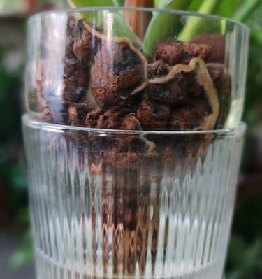 Dekorativ sind auch Pflanzen in Gefäßen mit Wasser, so dass die zarten Wurzeln zur Geltung kommen können. Auch hier genügt ein ca. monatlicher Wasserwechsel und die Gabe von etwas Hydrodünger.