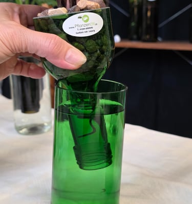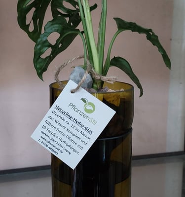 Besonders stolz sind wir auf unsere Hydrogläser, die wir in Handarbeit aus Weinflaschen, aber auch aus anderen Flaschen hergestellt und individuell liebevoll bepflanzt werden. Jedes Glas ist so ein Unikat. Ideal auch als nachhaltiges Geschenk.